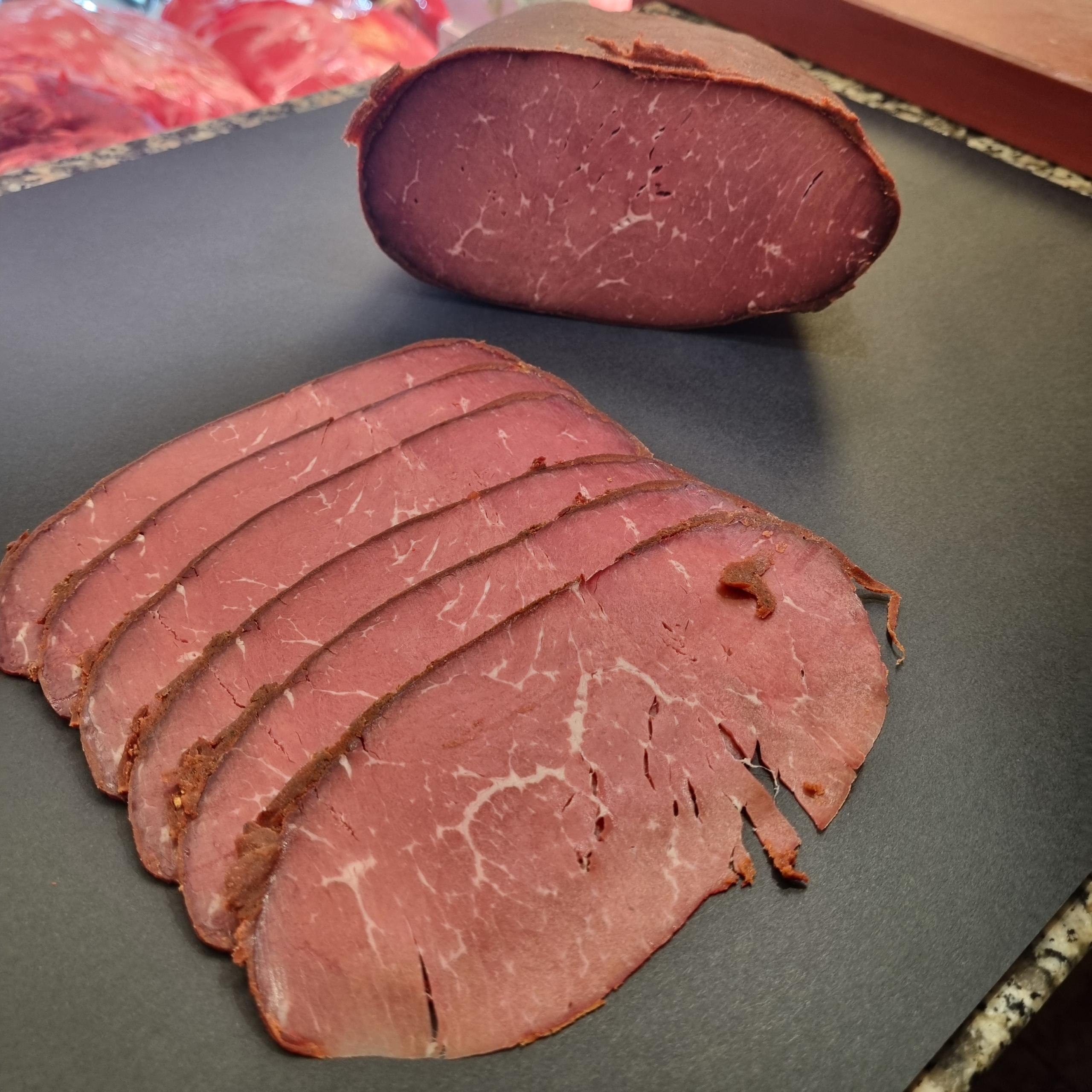Zutaten: Rinderoberschale, Pökelsalz, Gewürze (enthält GELBSENFMEHL), Sojamehl, Speisesalz, Rote Betepulver